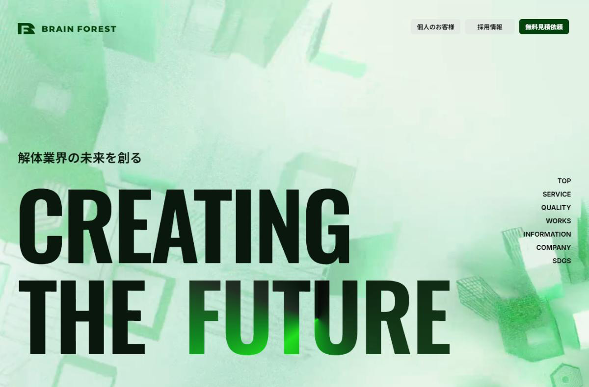 株式会社BrainForest(ブレインフォレスト)は、東海・関東・関西エリアの解体工事に対応。ISO9001、45001、14001認証取得、累計施工件数10,000件以上の実績で「日本で一番ありがとうが集まる解体屋」を目指します。